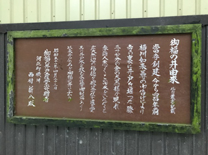 文禄四年に突如横川如来尊から「寺の裏に井戸を掘れ」との御告げがあり 檀家信徒が掘ったところ三寸七分(11.1センチ)の金の大黒様が現れた。 以来この井戸の水を頂くと「金運上昇」「出世開運」の他様々な福徳円満を授かると言われ 昨今では化粧水代わりに使うと美肌になるとも言われています。